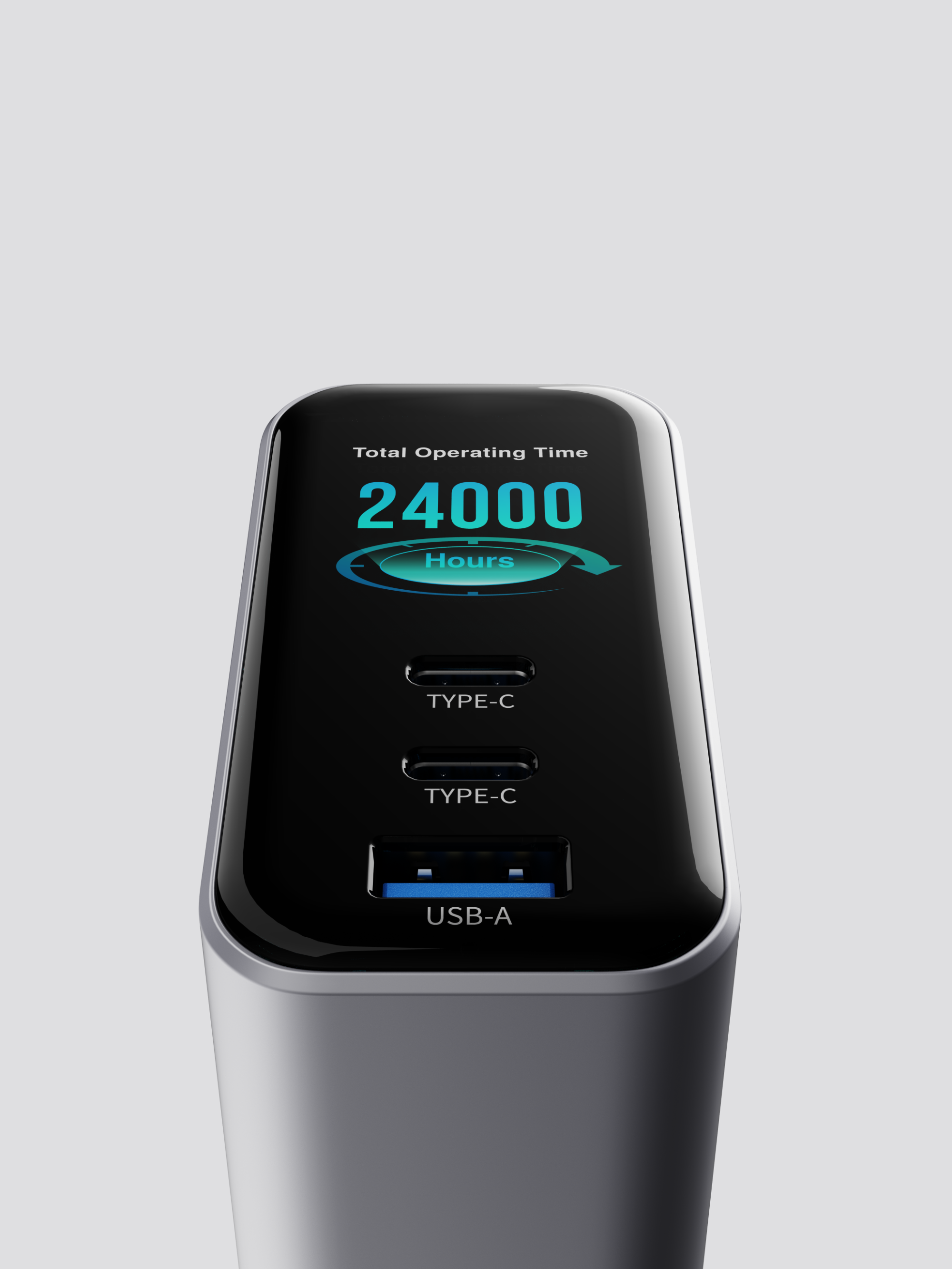 This charger is equipped with an TFT LCD screen that supports the power display of all USB ports. By touching the buttons, the screen direction can be flipped, and the total output power display or the power display of a single port can be switched, as well as the charger temperature display, so that users can understand the charging status of the device. The screen can also record the usage time of the charger, and the visual design allows users to understand the charging status throughout the process, which is more practical.