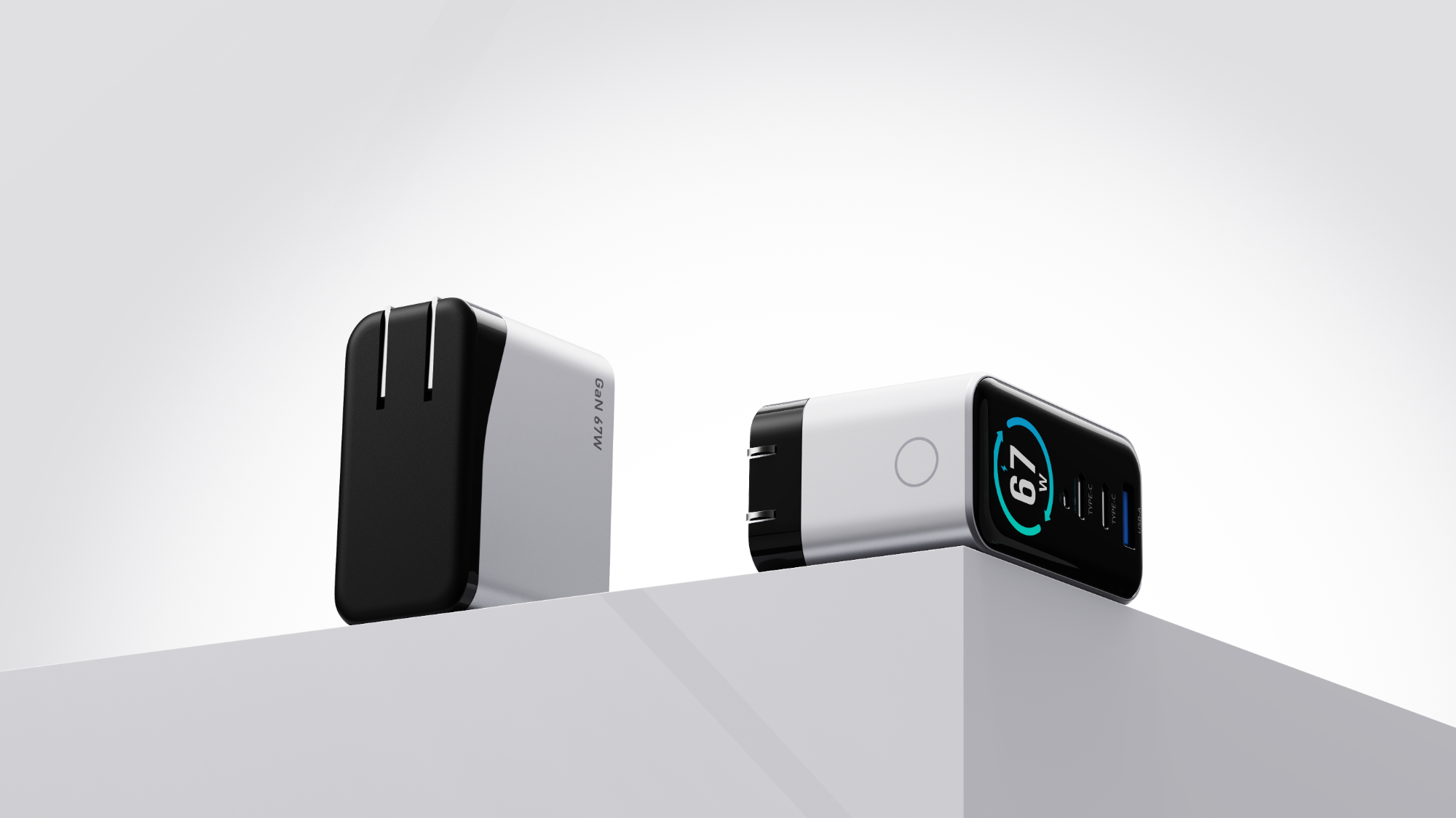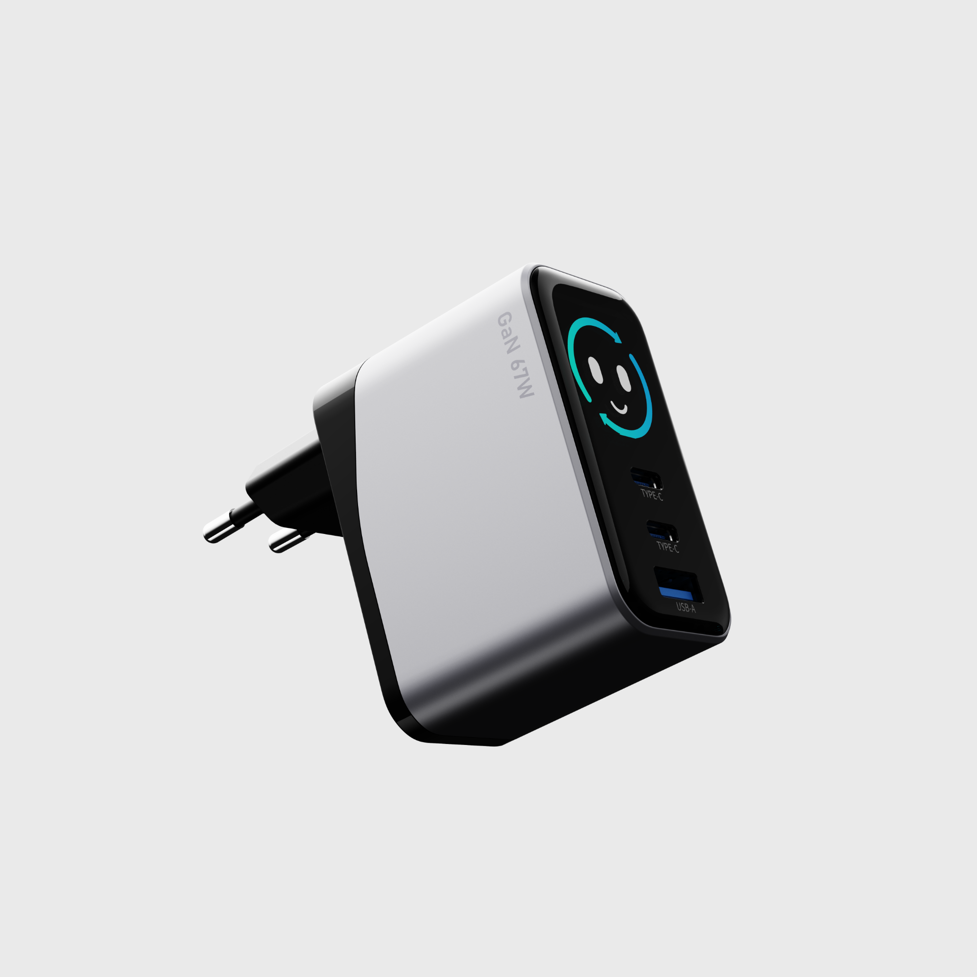 Compact 67W 3-Port GaN PD fast charger with TFT LCD Screen, Its appearance is high-end and exquisite, with a new design language. The body surface is sprayed with silver or silver-gray paint, the pin part is black, and the top is decorated with a black bright panel. It is not only small and exquisite as a whole, but also has a strong sense of technology.