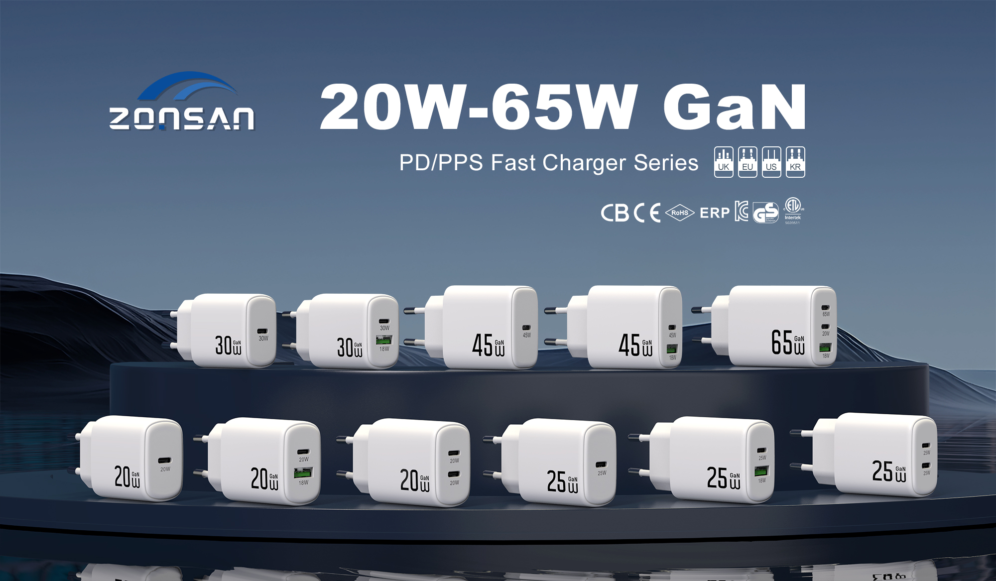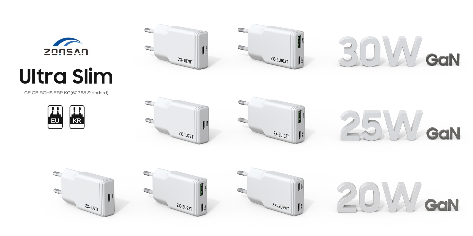 ZONSAN was established in 2009, professional OEM/ODM rer of GaN chargers, GaN charger with LCD Screen Display, Retracttable GaN charger, Ultra Slim charger, 3 in 1 multifunctional charger, Desktop charger & QC3.0 quick chargers.