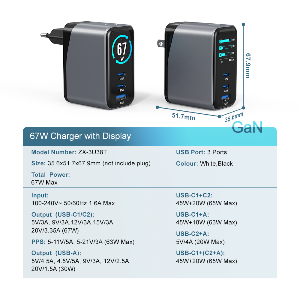 Display Gan Charger 65w 67w PPS Smart Charging Mobile Phone Fast Charger Wall PD 65w Charger KC | ZX-3U38T