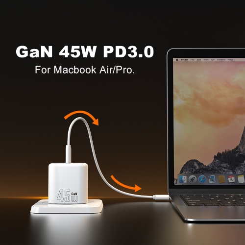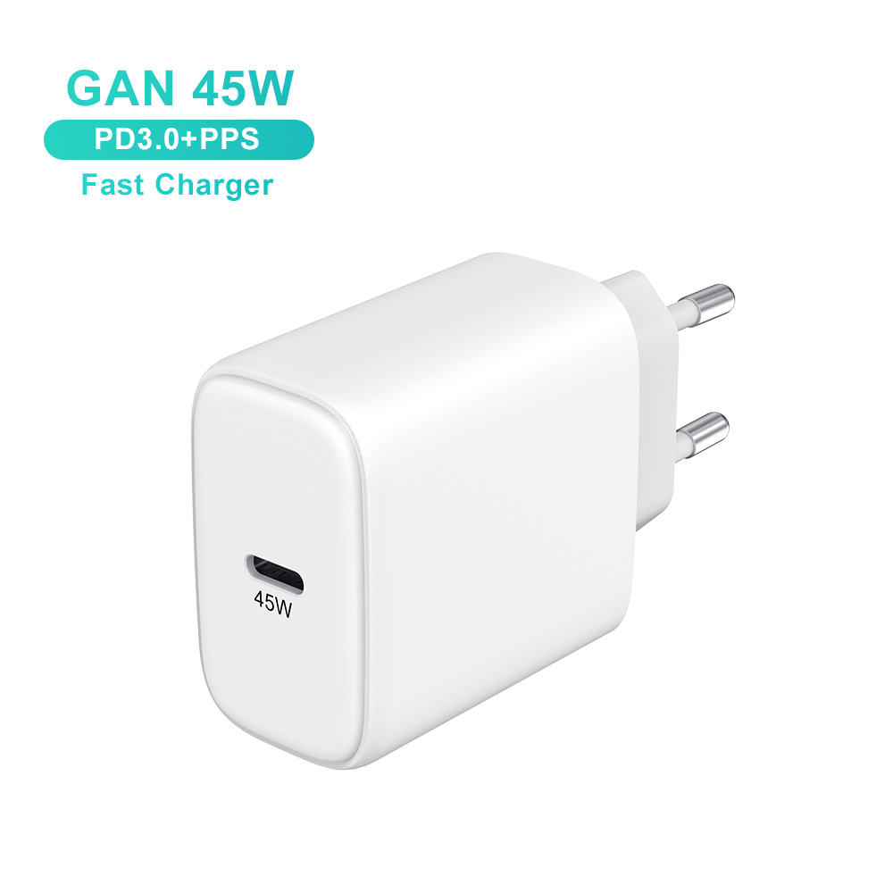 Ultra-compact 45W GaN Charger with single USB-C port. Supports PD fast charging for smartphones, tablets, and laptops.