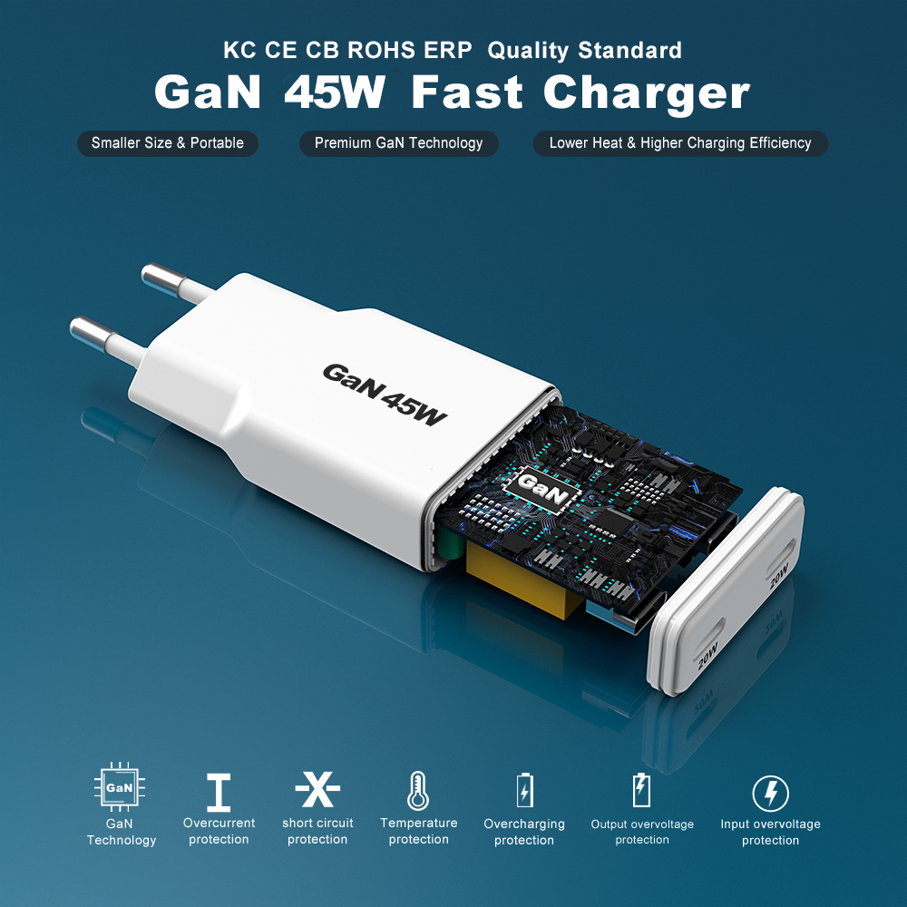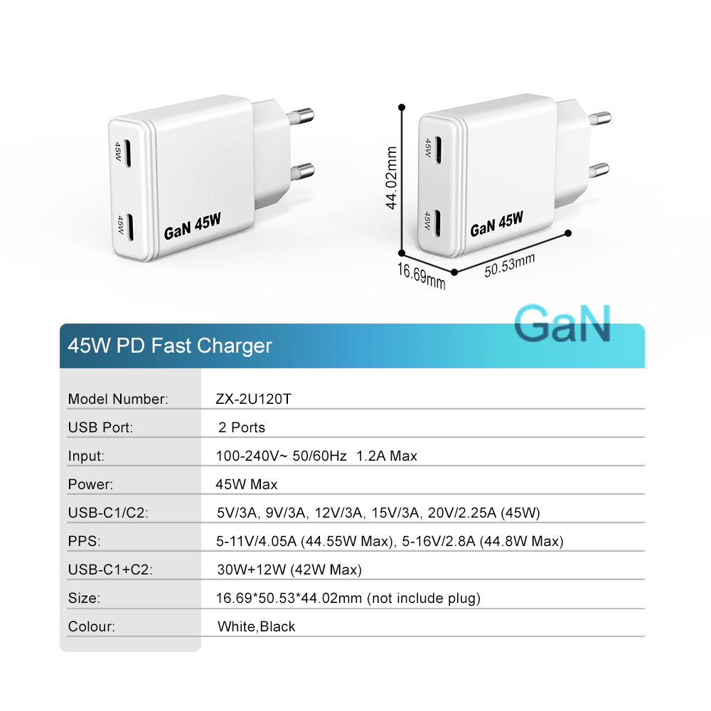 KC 45W Gan Charger Type C 2 Ports Fast Charging Smartphone 45w Wall Charger PD | ZX-2U120T