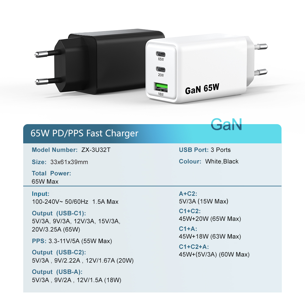 Smartphones 65W Gan Charger Type c 3 Ports PD Charger 65W | ZX-3U32T
