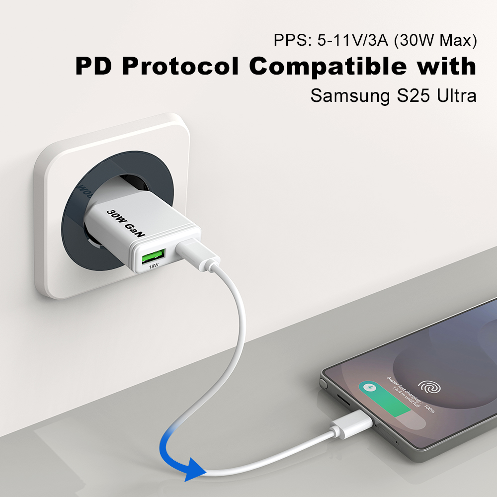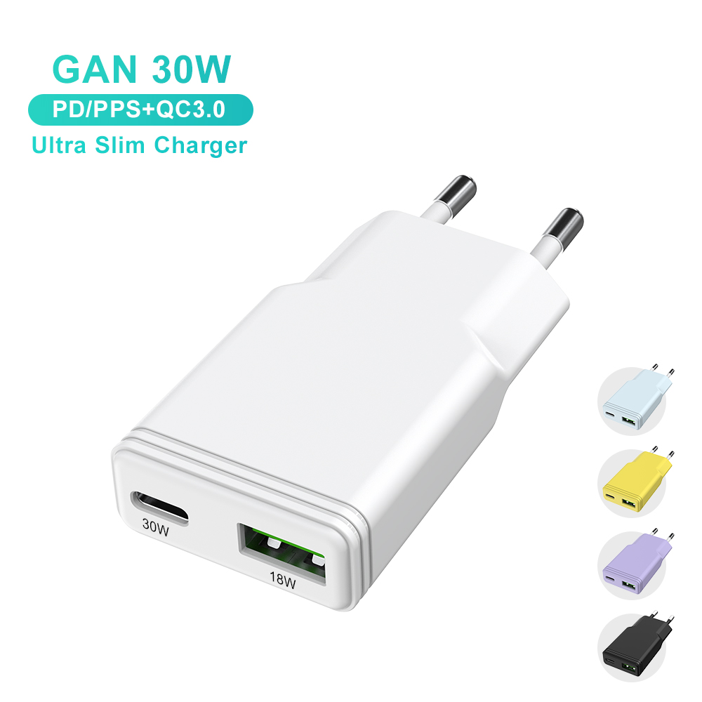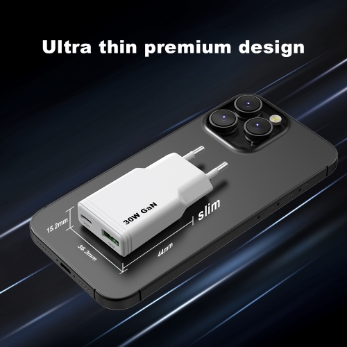 Portable 30W slim charger with USB-C PD. Compact, travel-friendly, and safe charger for smartphones and ultrabooks.
