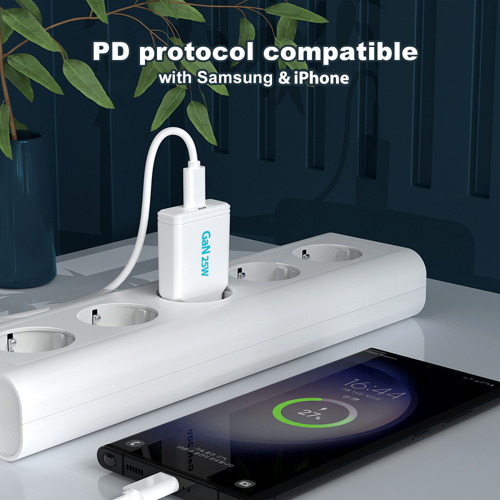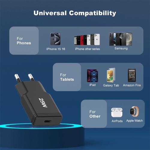 Discover the ultra-slim 25W charger with USB-C fast charging. Perfect for smartphones and tablets, safe and portable for daily use.